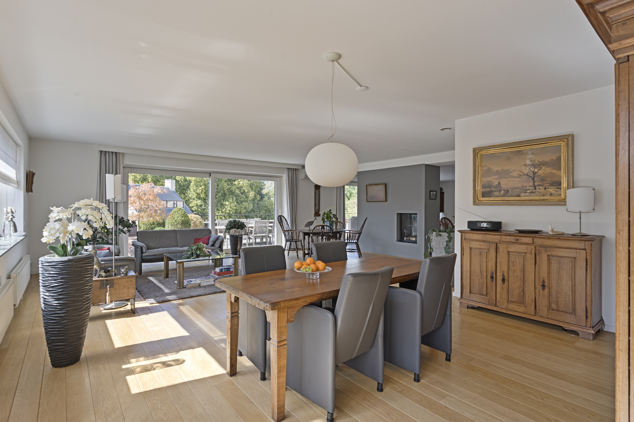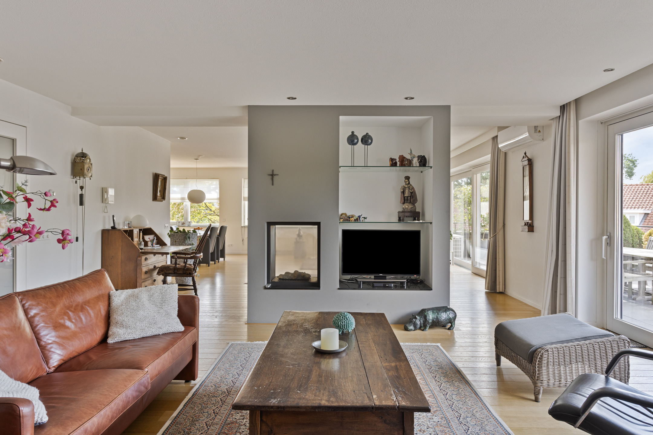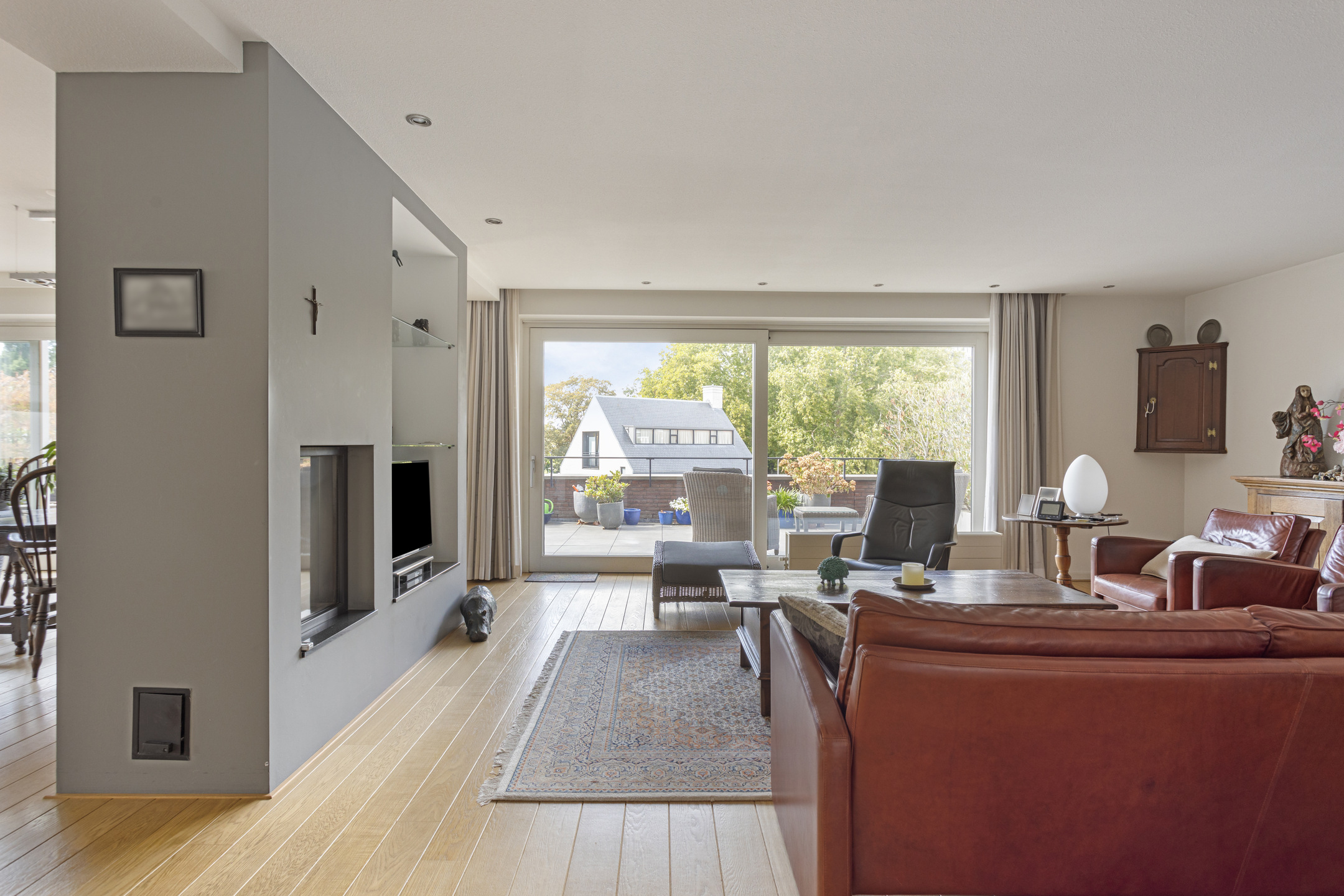 Ruime woonkamer met doorkijk gashaard, houten vloer en veel lichtinval