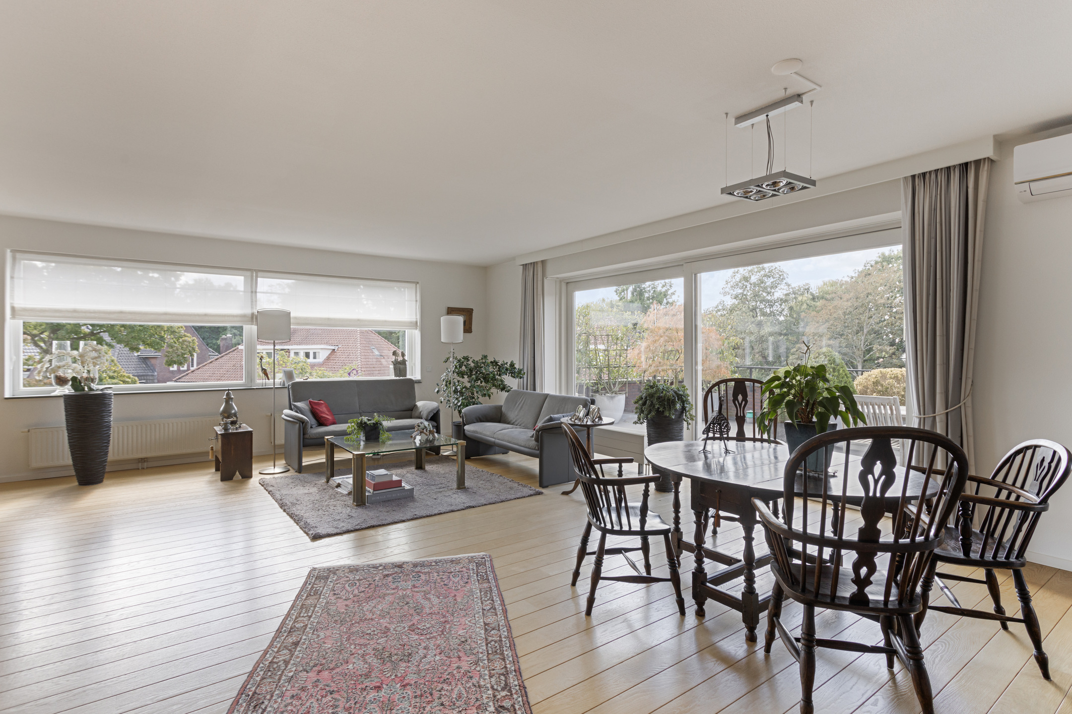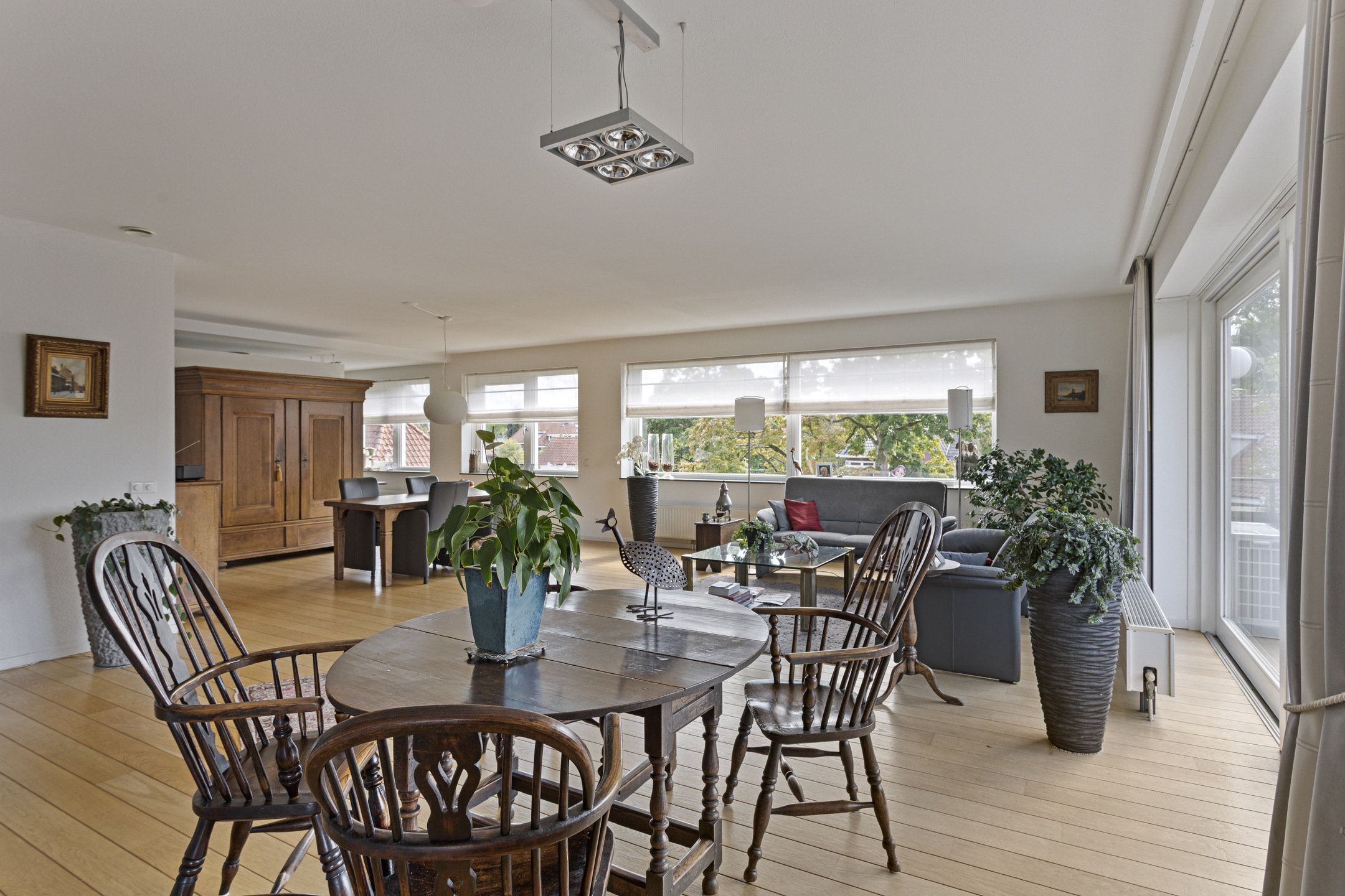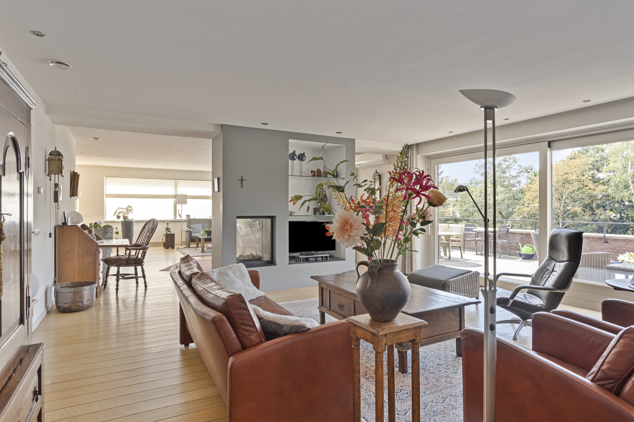 Ruime woonkamer met doorkijk gashaard, houten vloer en veel lichtinval
