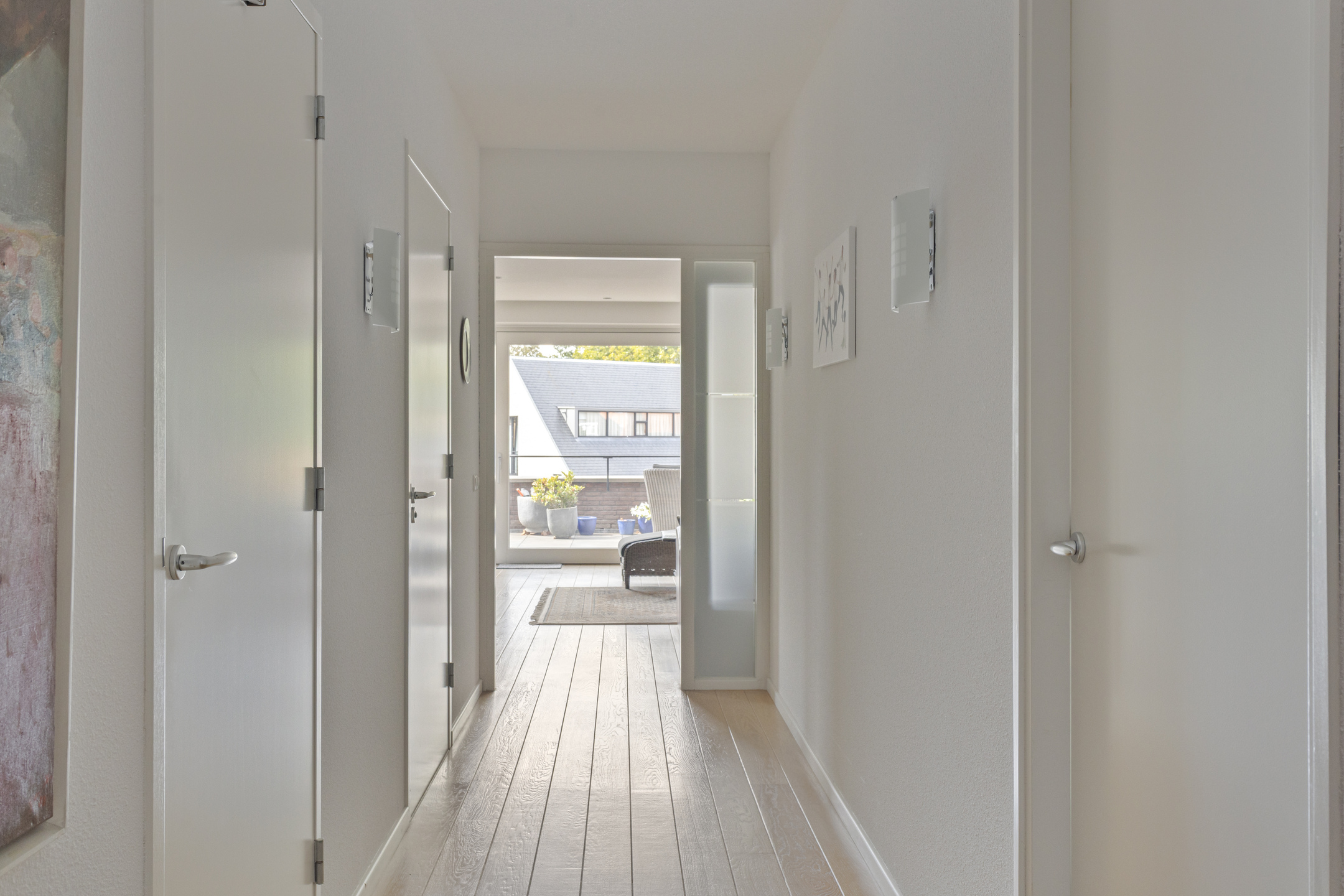 De afwerking is strak: een nette houten vloer, gestucte wanden en plafonds met inbouwspots. Een LG dual inverter airco zorgt voor een behaaglijke temperatuur, ongeacht het seizoen. In de woonkamer is de videofoon geplaatst waarmee u bezoekers binnenlaat. De intercom beschikt over beeld, zodat u altijd ziet wie er aanbelt.