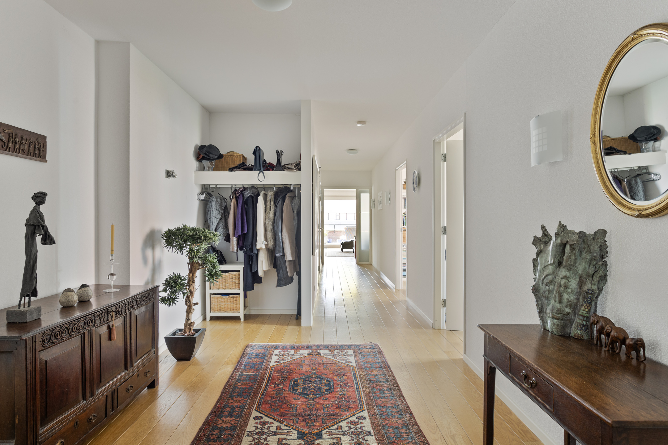 De entree geeft toegang tot een ruime en lichte hal die u direct het gevoel van ruimte geeft. Vanuit hier bereikt u drie slaapkamers, de badkamer, een berging en de woonkamer. Dankzij de lange schuifpuien die de hal verlichten, wordt u vanzelf naar de leefruimte geleid.