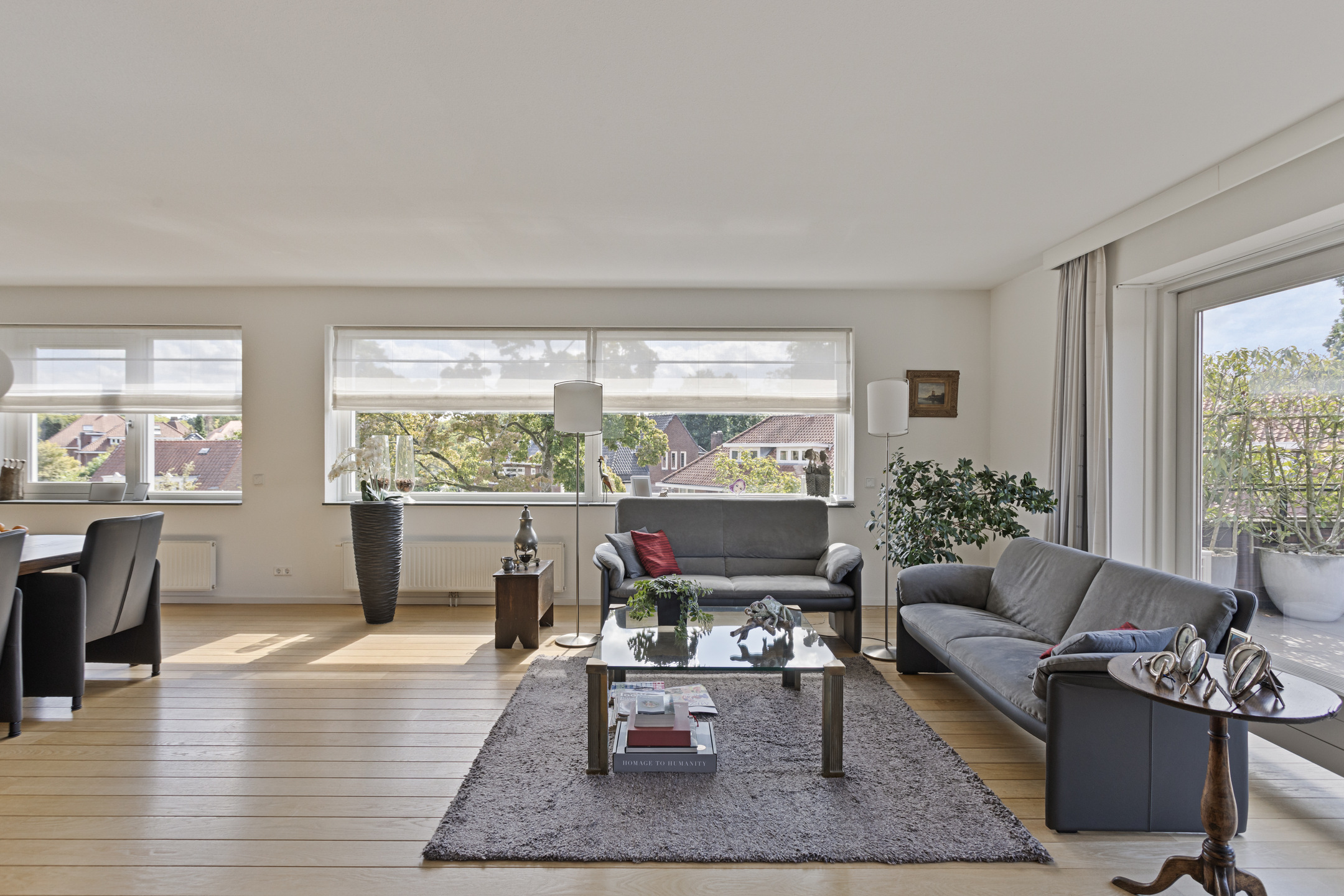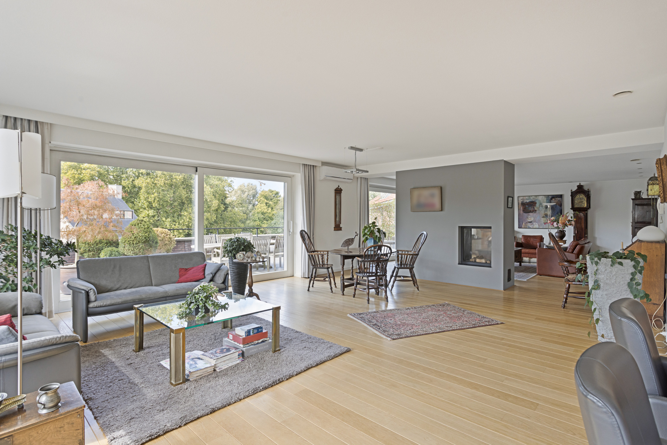 De woonkamer is een indrukwekkende ruimte en verdeeld in twee delen door een stijlvolle doorkijk gashaard. Aan de ene zijde vindt u een ruime zithoek met volop lichtinval, aan de andere kant een plek voor een royale eettafel. De roomdivider heeft een ingebouwde nis voor uw televisie. Grote schuifpuien voorzien van screens geven toegang tot het dakterras en zorgen voor een vloeiende overgang tussen binnen en buiten.