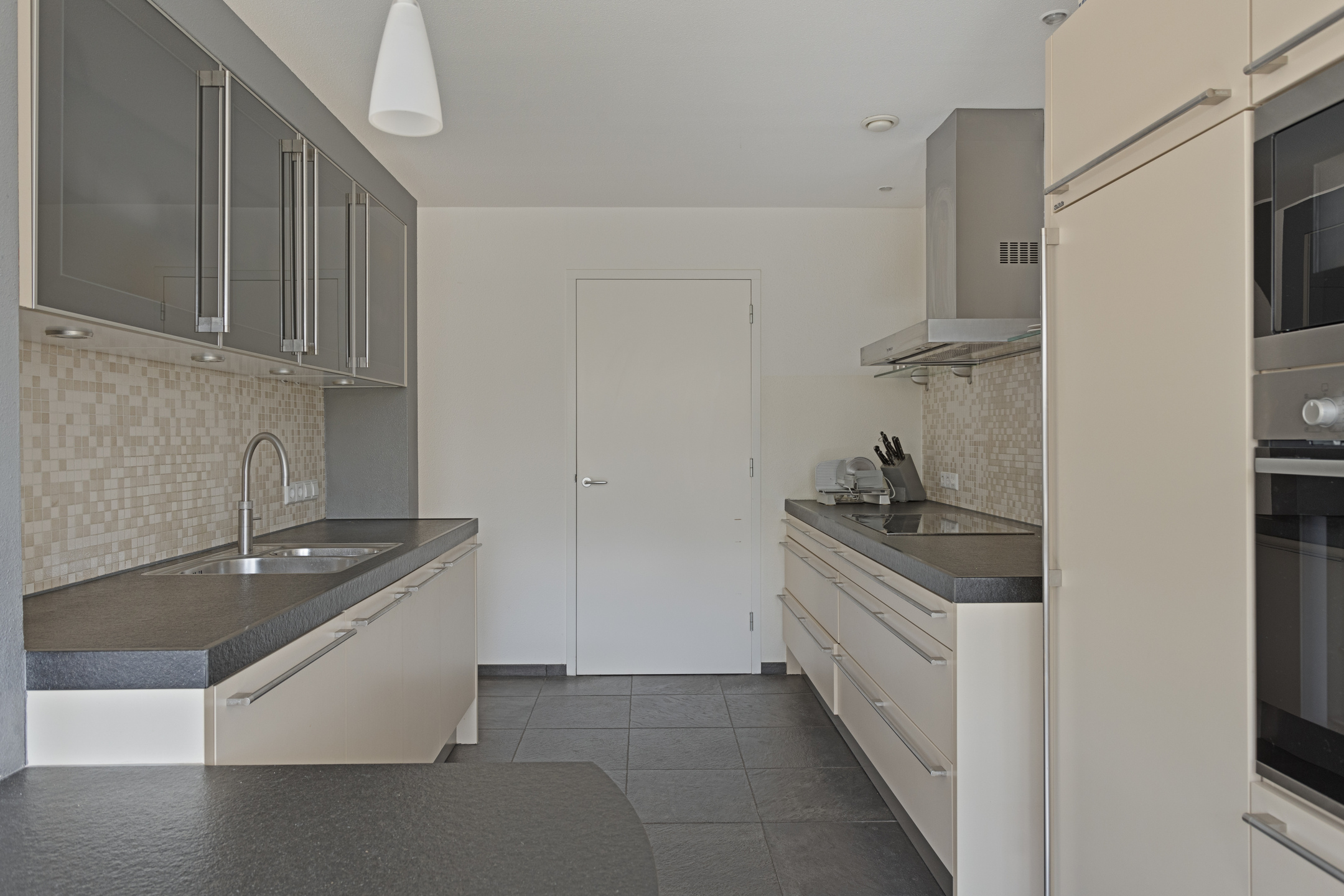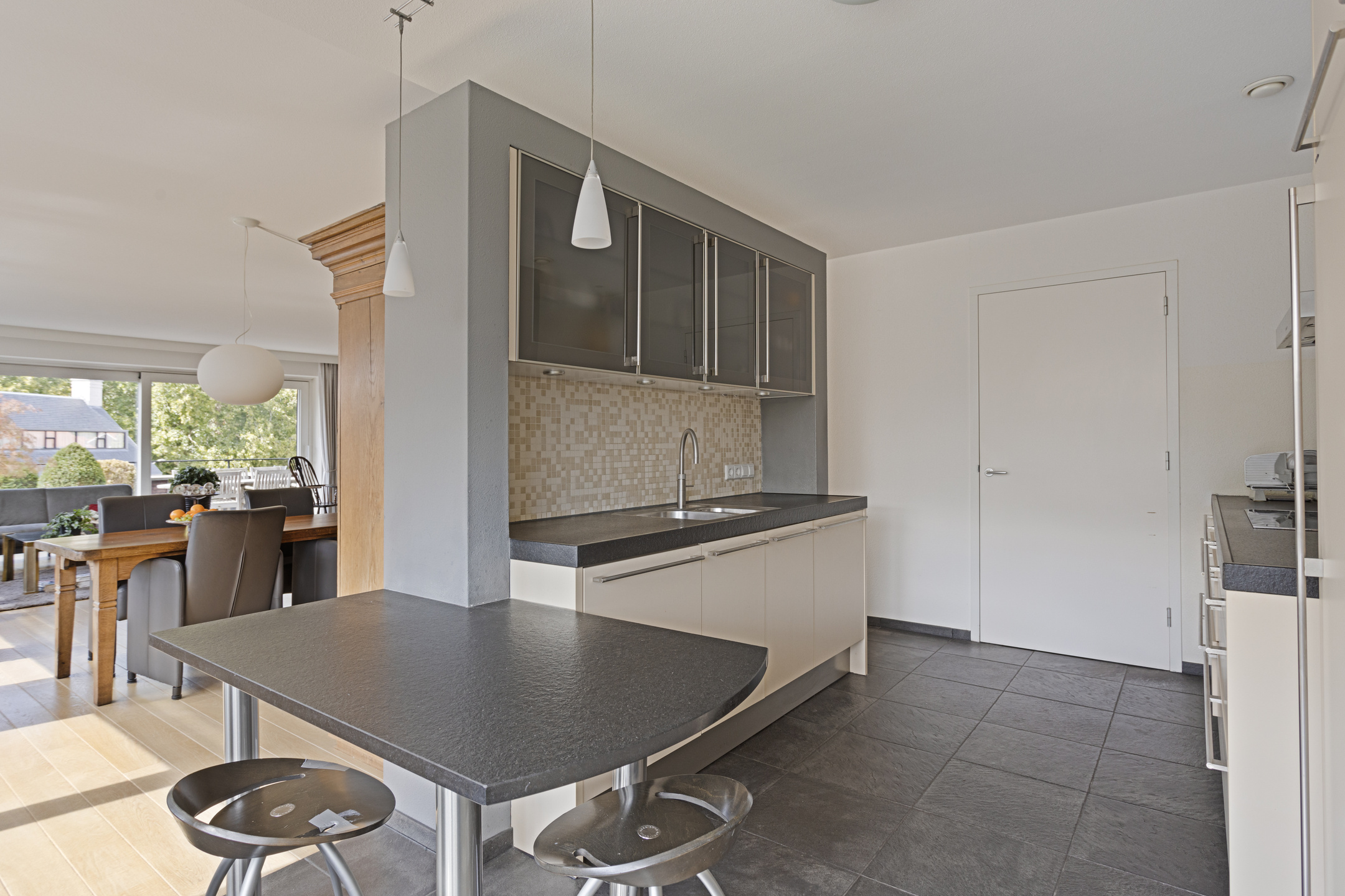 De keuken is bereikbaar via de woonkamer en de hal. Op de vloer ligt natuursteen en de wanden zijn halfhoog betegeld. De keuken bestaat uit een wandopstelling met bovenkasten met glazen fronten en een keukenblok met Quooker en een spoelbak.