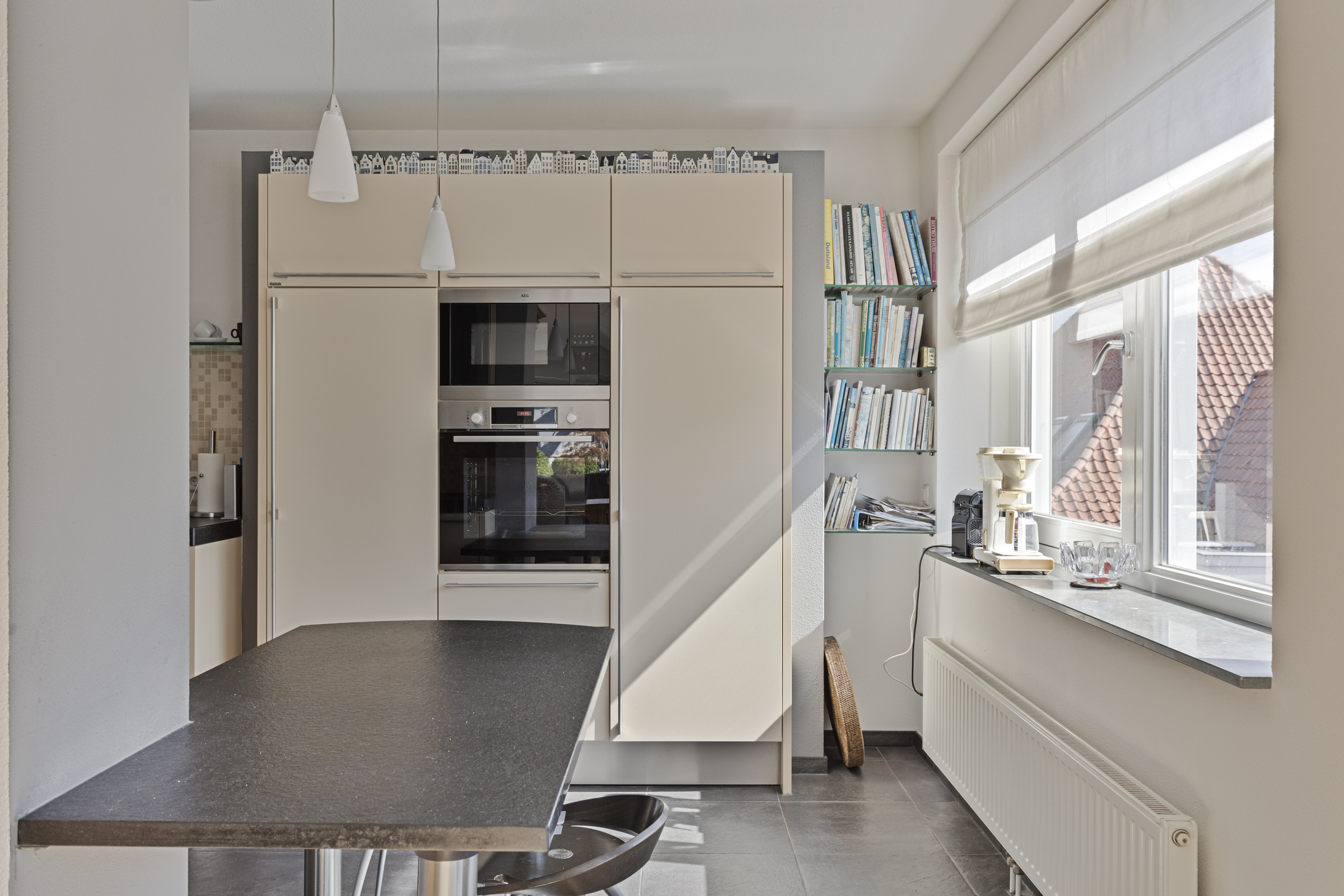 De voorzieningen zijn compleet: een inductiekookplaat, afzuigkap, koelkast, oven, magnetron en vaatwasser. Het natuurstenen werkblad loopt door in een handige bar/tafel waar u aan kunt ontbijten of koken in gezelschap. Vanuit de keuken heeft u toegang tot de berging.