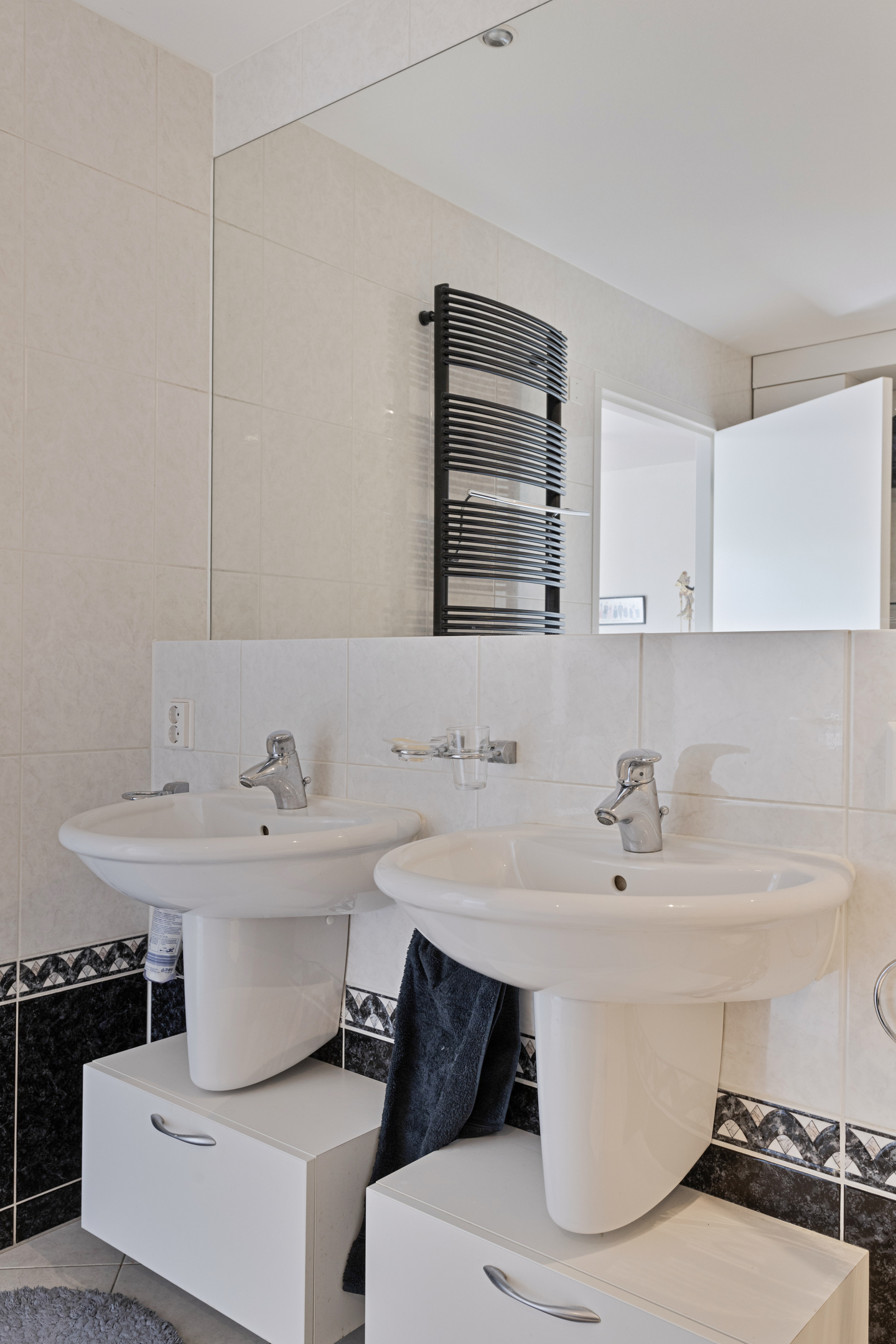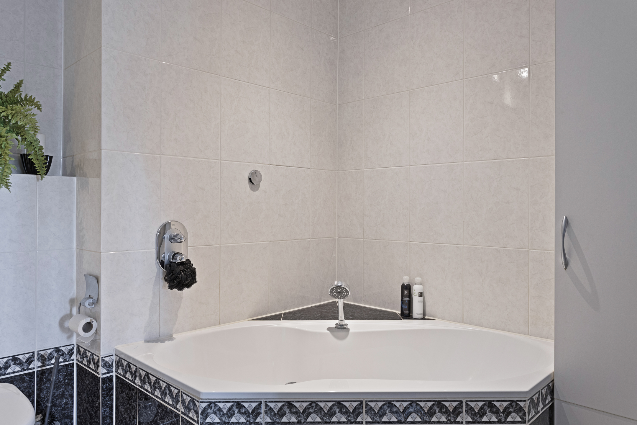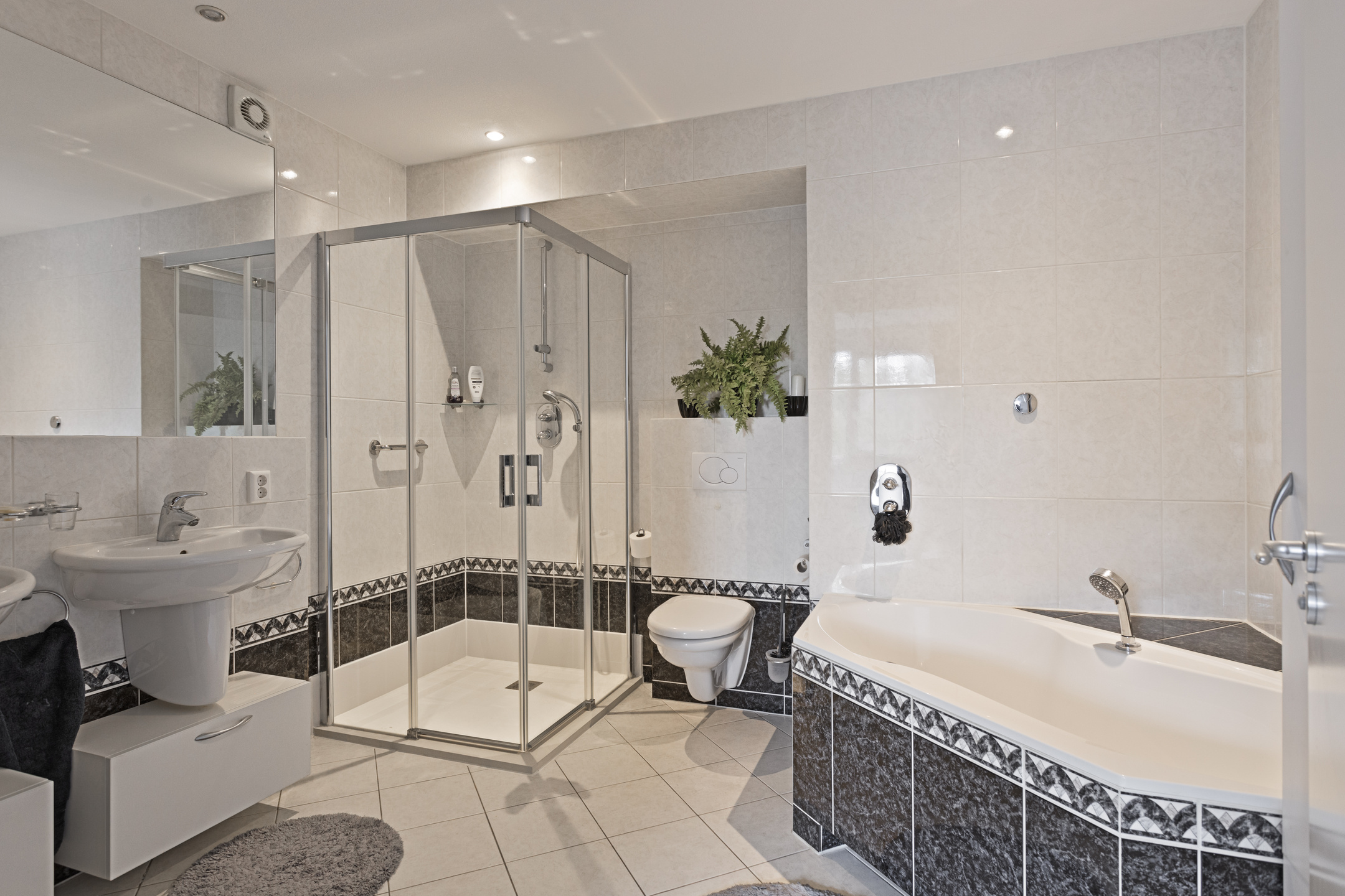 De ensuite badkamer is volledig ingericht en biedt alles wat u wenst: een ruim ligbad, een inloopdouche, een wandcloset, dubbele wastafel, inbouwspots, mechanische ventilatie en een handdoekradiator.