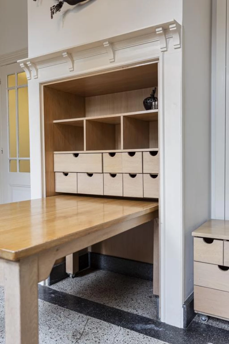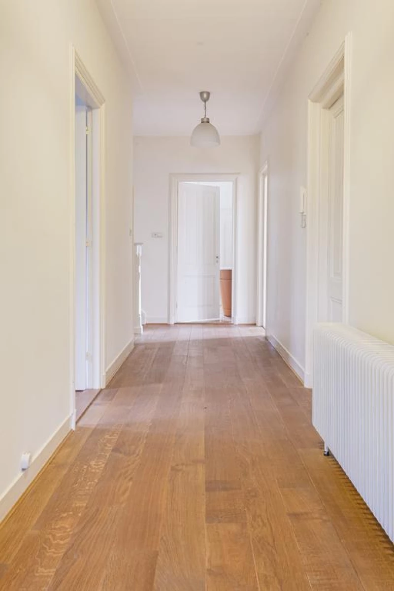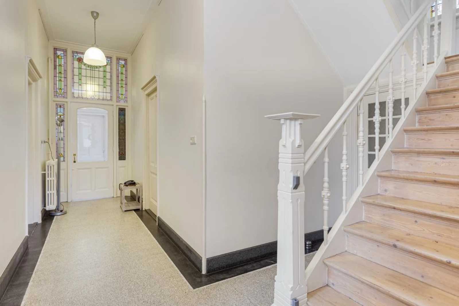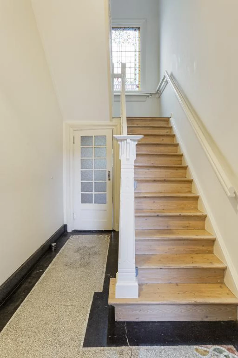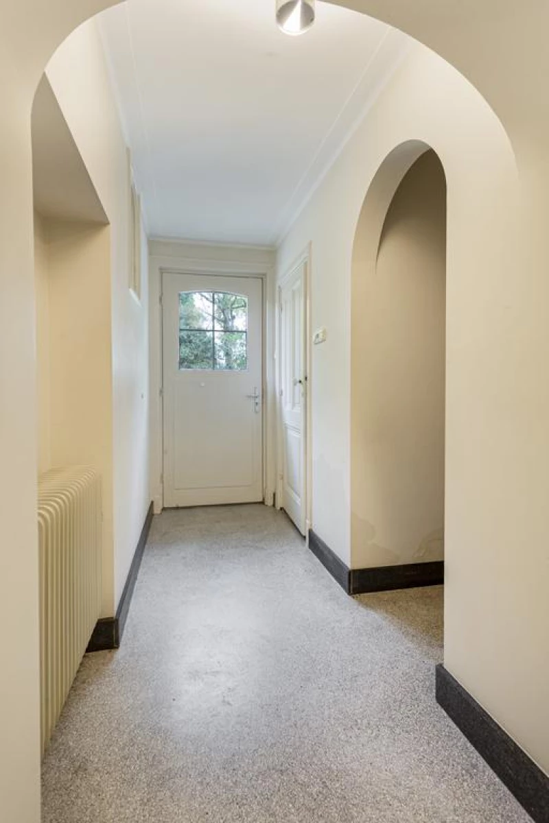 Via de vestibule met een prachtige tussendeur met authentieke glas-in-lood ramen, naar de centrale hal met een gerestaureerde terrazzo vloer. In de centrale hal is een garderobehoek en een toiletruimte met wandcloset.