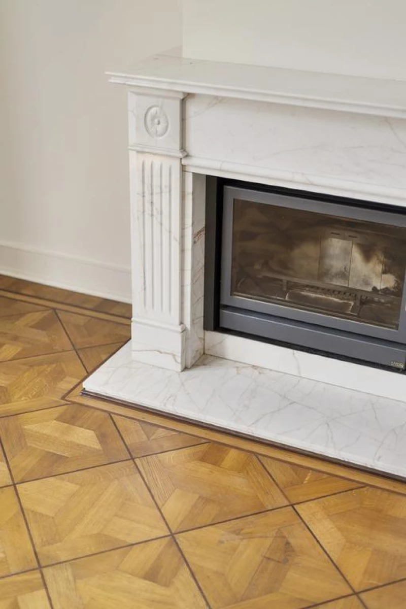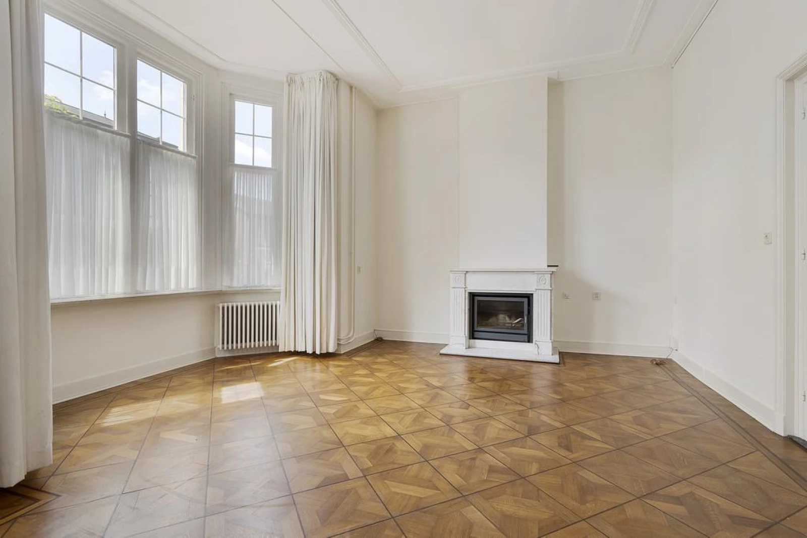 Aan de voorzijde ligt een royale woonkamer en suite, met een parketvloer, schuifdeuren en een erker. In beide ruimten een mooie marmeren schouw met aan een zijde een inzethaard van Bodart & Gonay.