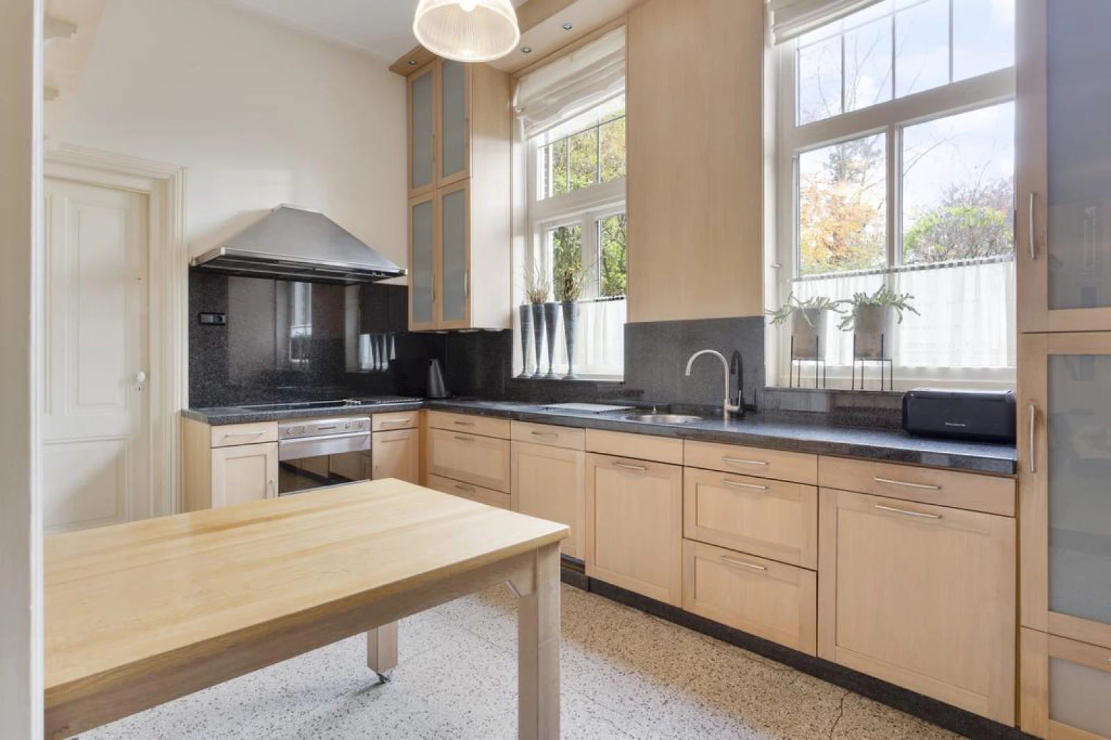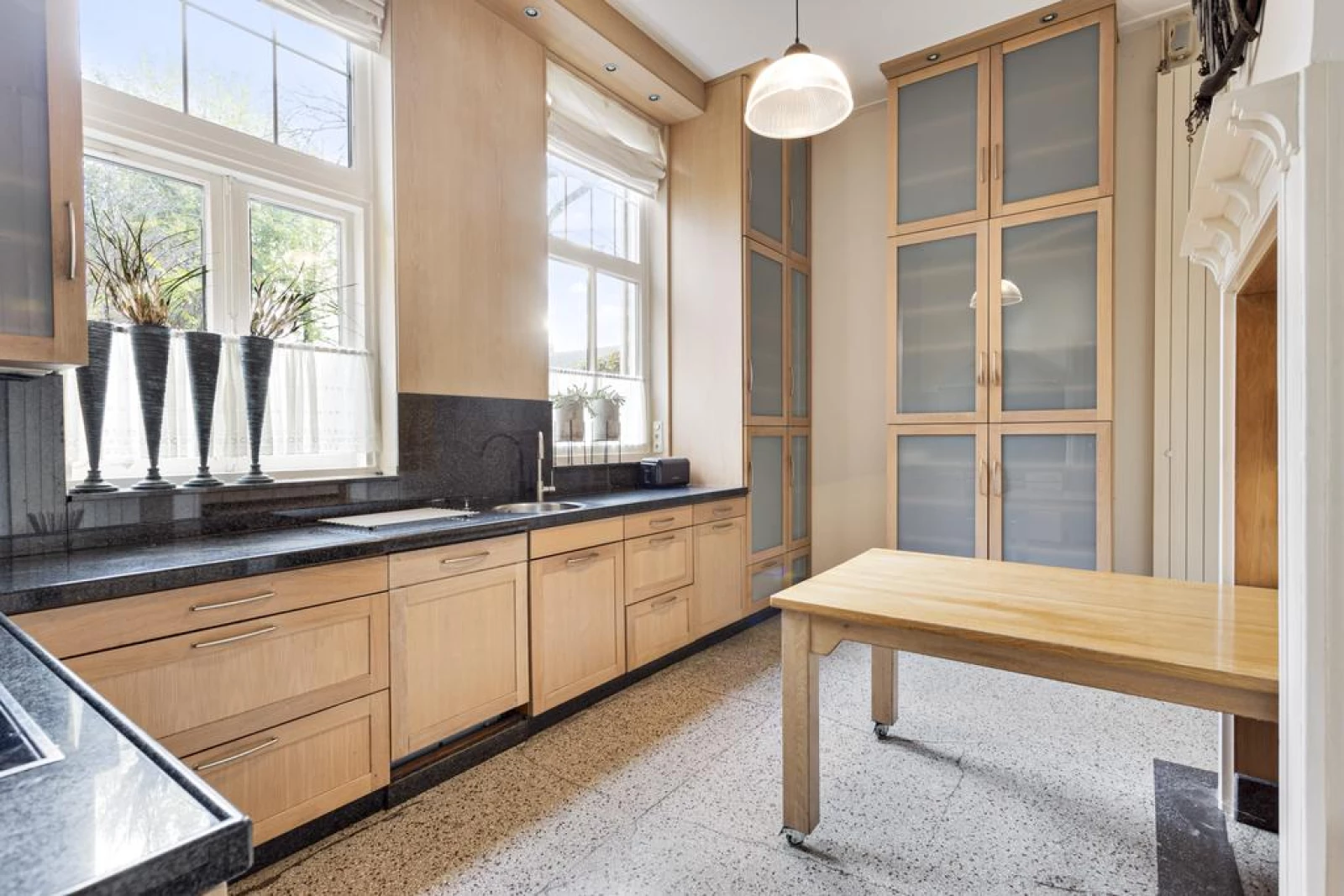 De ruim opgezette keuken heeft een terrazzo vloer en een lichteiken keukeninrichting met een granieten aanrechtblad en achterwand. O.a. een SMEG elektrische kookplaat en heteluchtoven, een Siemens vaatwasser en veel kasten/laden. Verder twee hoge raamkozijnen in de zijgevel met uitkijk op de zijtuin. Vanuit de keuken naar de droge en 'stahoge' kelderruimte, ideaal te gebruiken als voorraad- c.q. wijnkelder. Hier bevindt zich o.a. de vernieuwde, uitgebreide meterkast met o.a. krachtstroom.