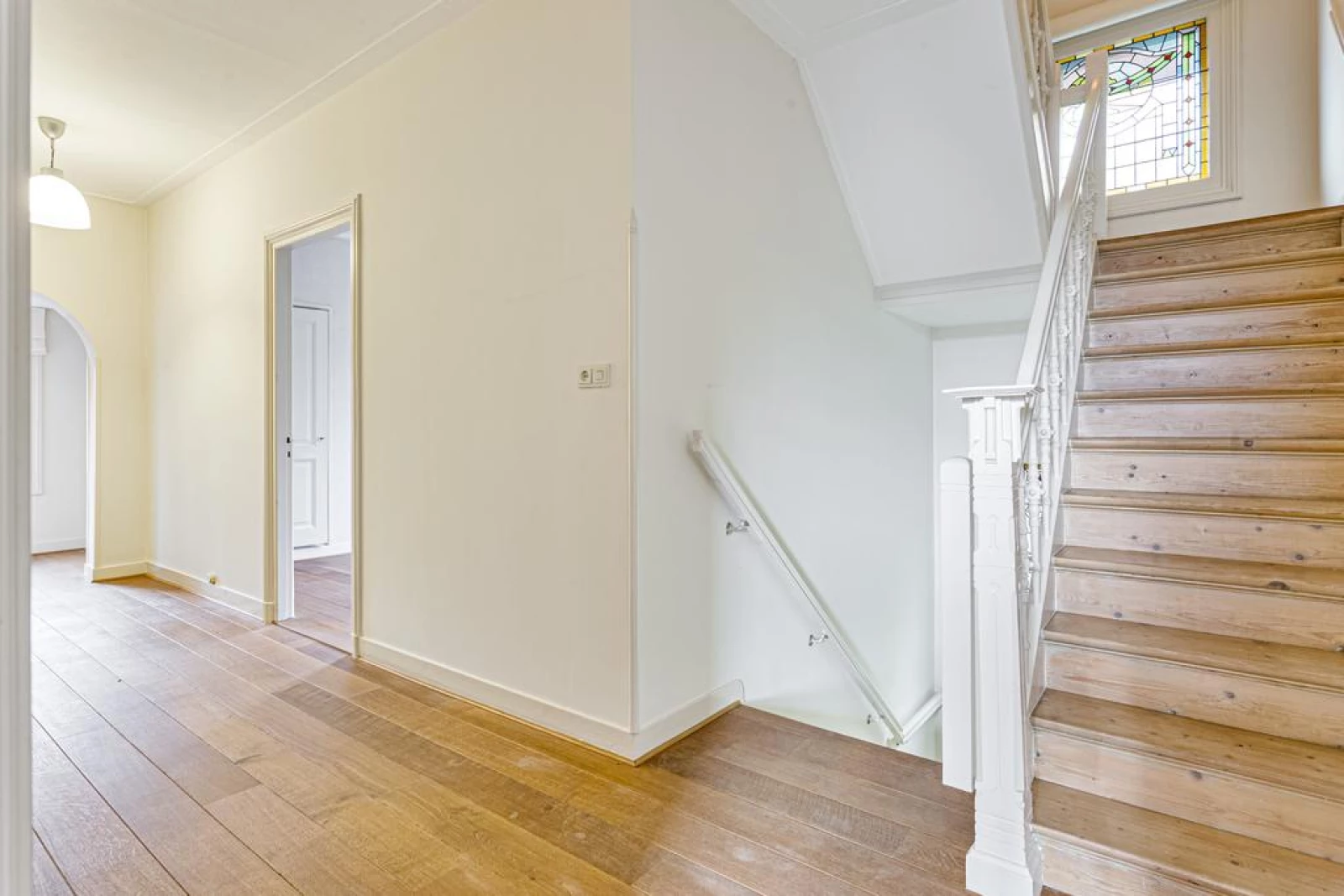 * Diverse glas-in-lood ramen en originele architraven en paneeldeuren;