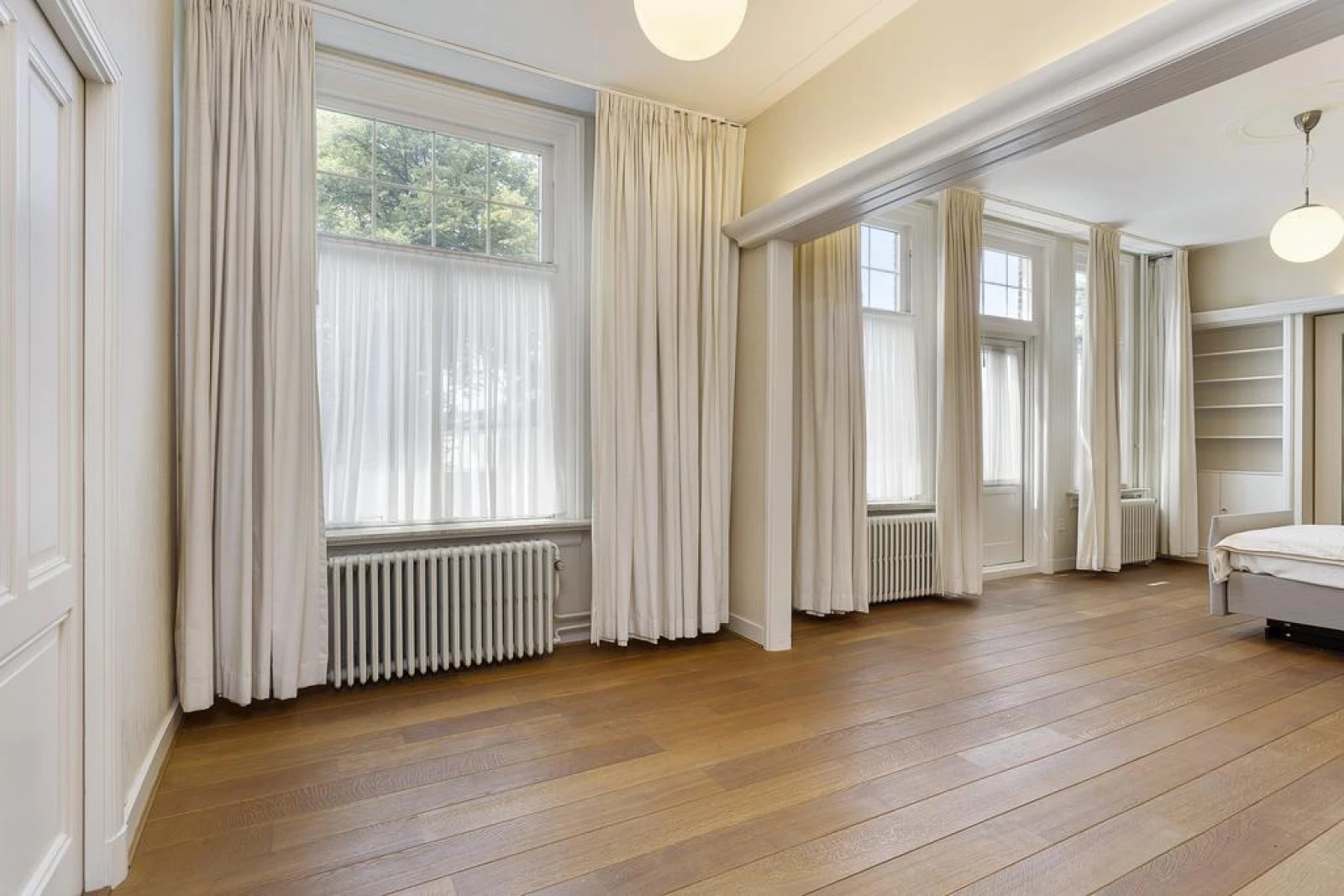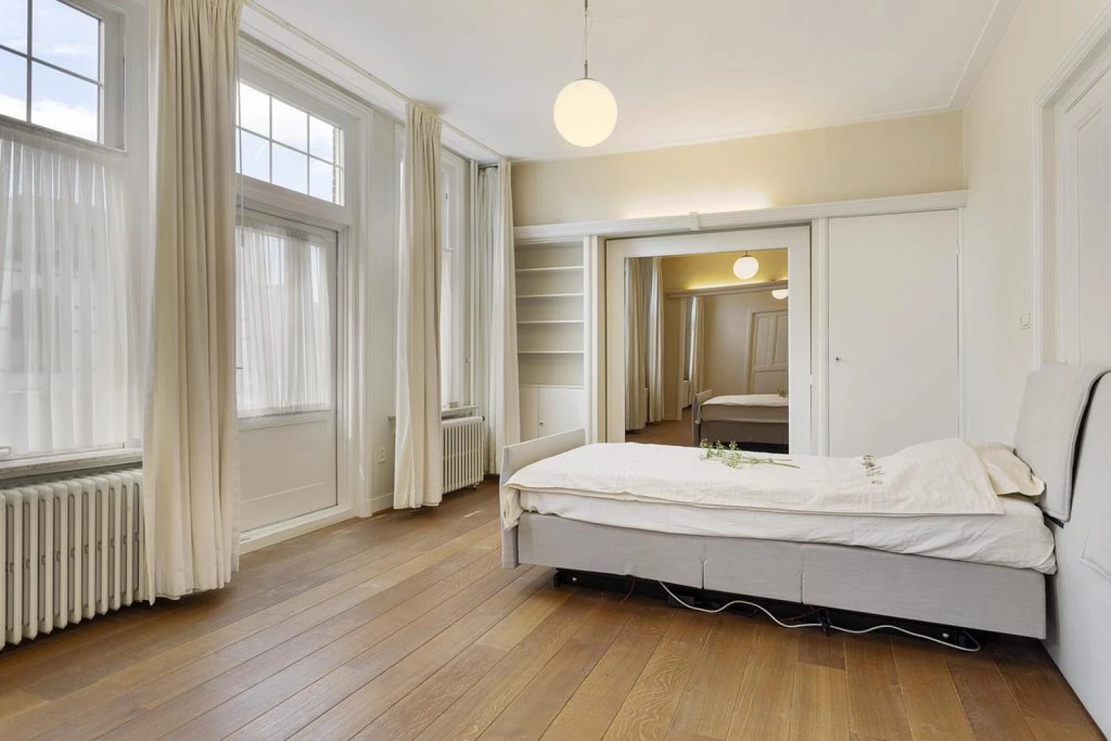 Rechtstreeks via badkamer toegang tot de kleedruimte, welke grenst aan de hoofdslaapkamer aan de voorzijde. Voorheen 2 slaapkamers. Met o.a. een kastenwand en toegang tot het balkon op de erker.