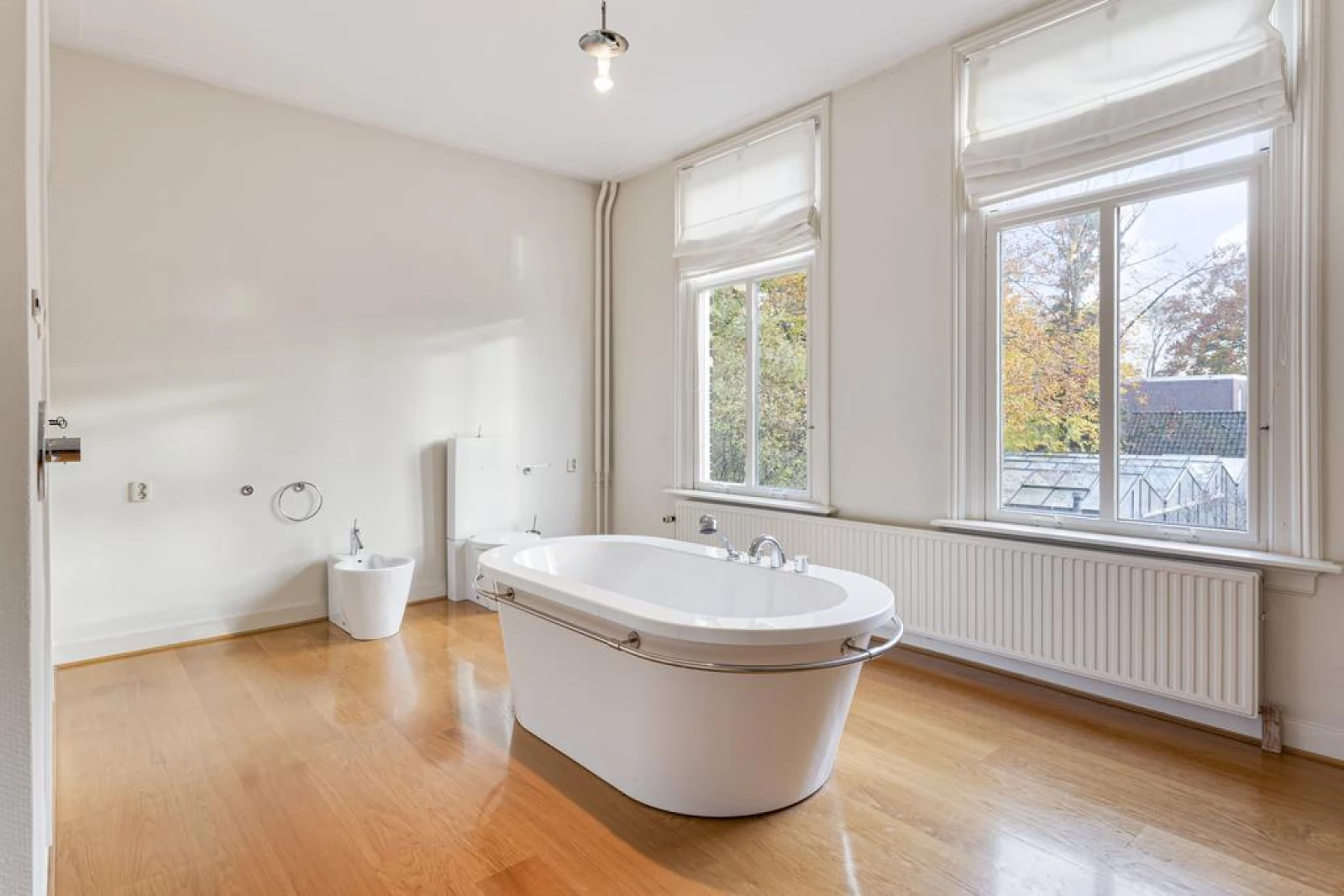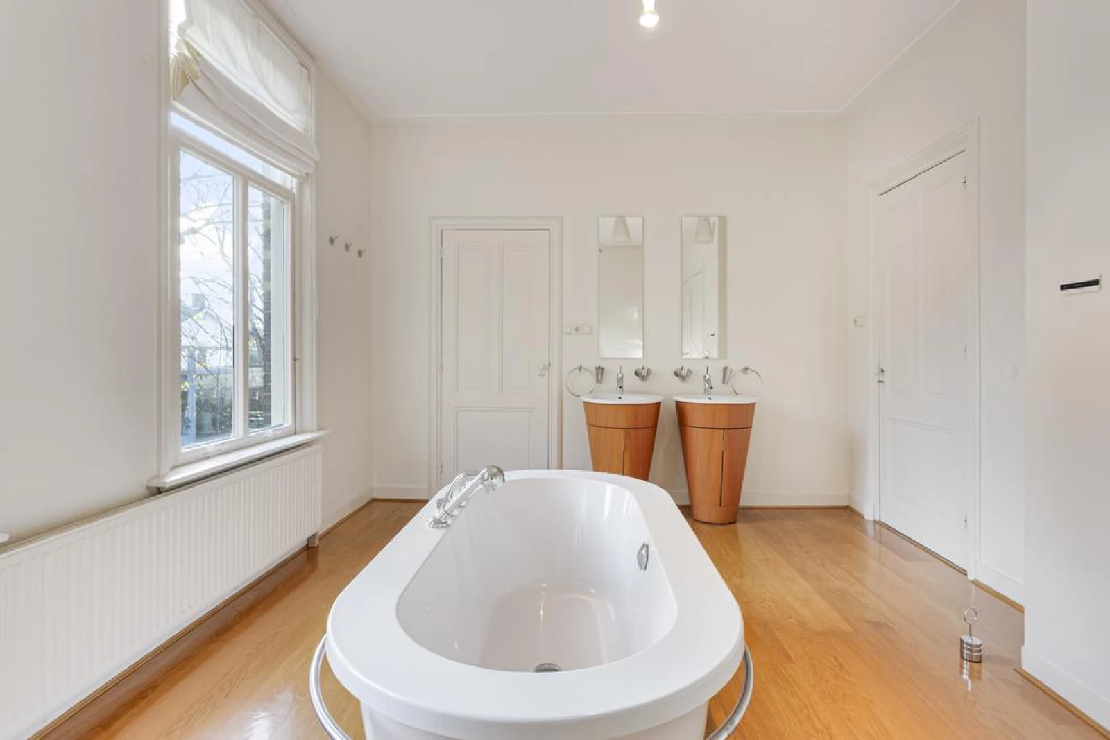 Ruime badkamer met een parketvloer en een luxe (design) afwerkingsniveau. Met o.a. twee wastafels, een vrijstaand ligbad, een wandcloset en bidet. Daglicht en ventilatie via de twee raamkozijnen in de zijgevel.