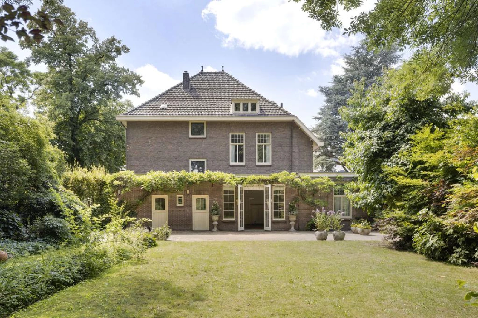 Aan de linkerzijde van de villa ligt een brede oprit met toegang tot de aanpandige garage met fraaie openslaande deuren. Aan de rechterzijde is de zij- en achtertuin, via een poort, bereikbaar. Achter de villa ligt over de gehele breedte een riant terras omzoomd met een prachtige parktuin met diverse boomsoorten. Deze 'groene' oase biedt u maximale