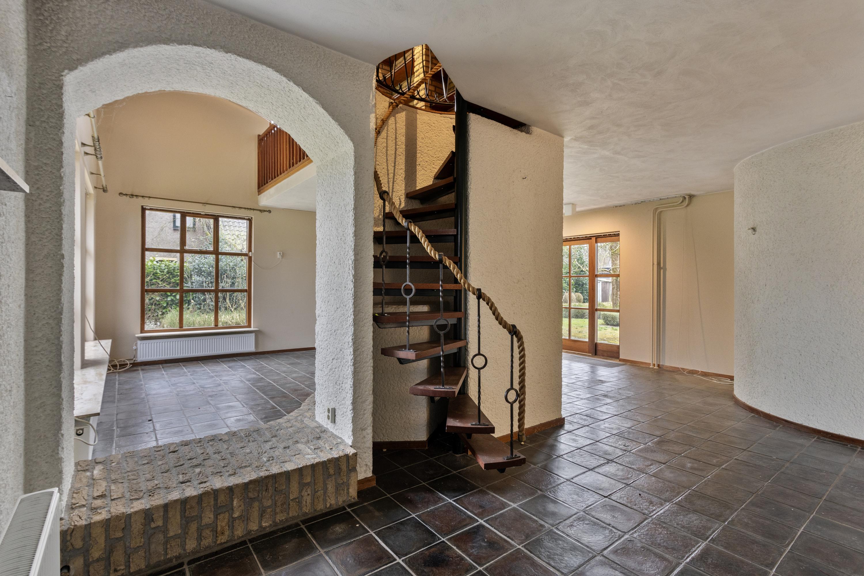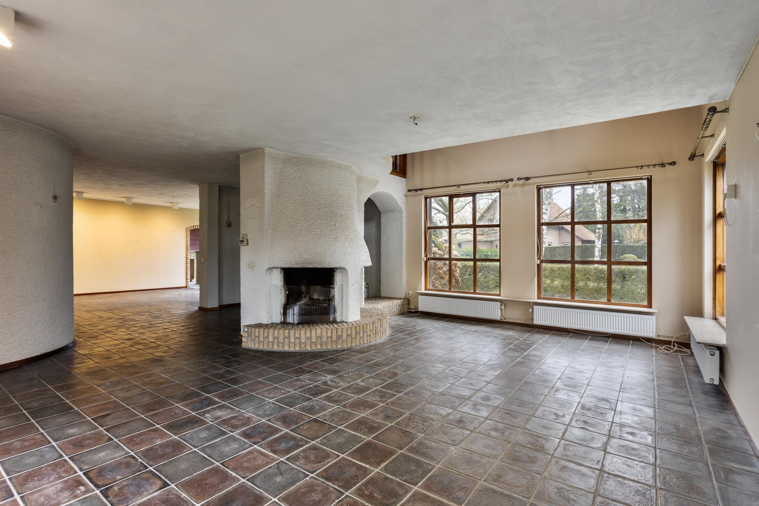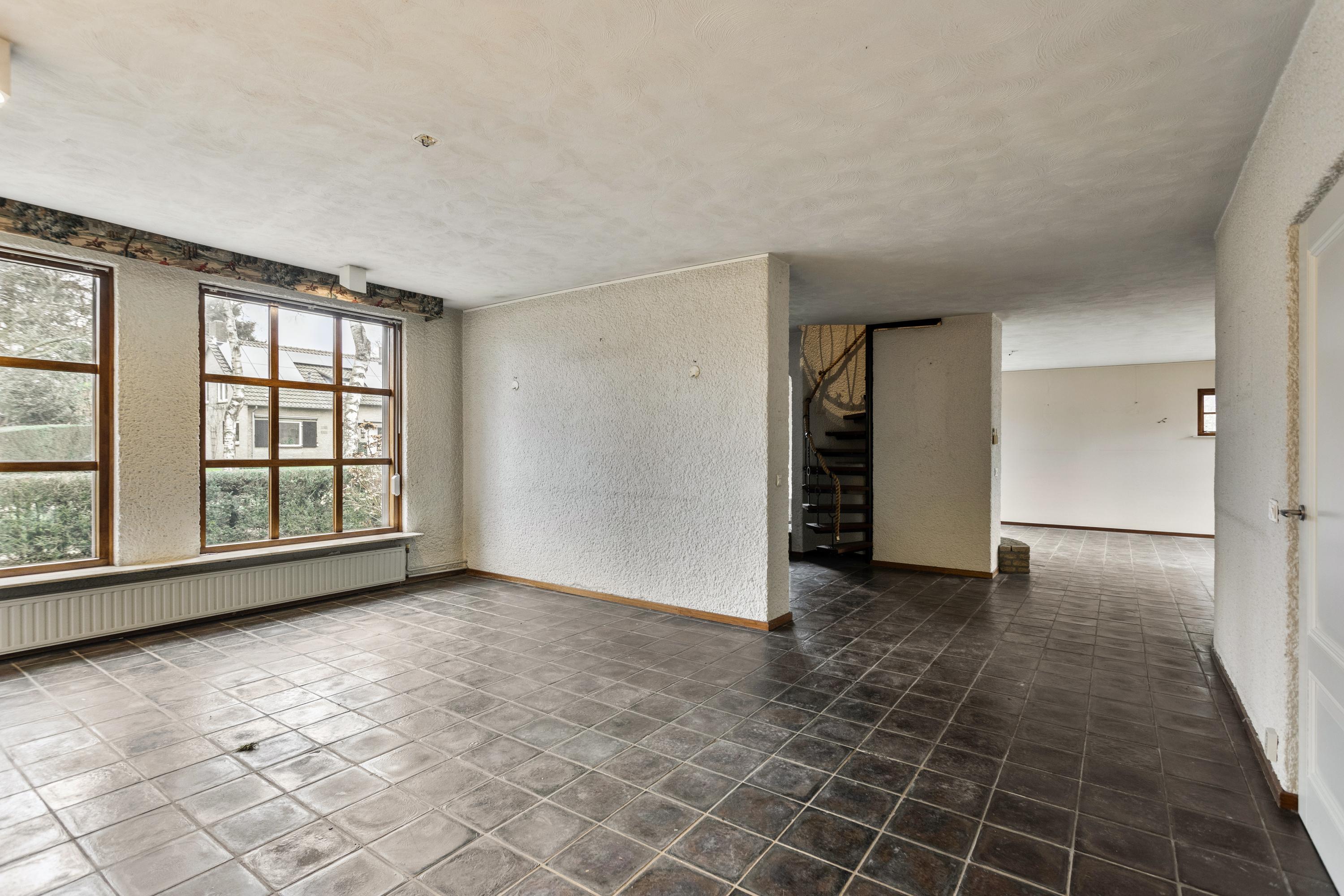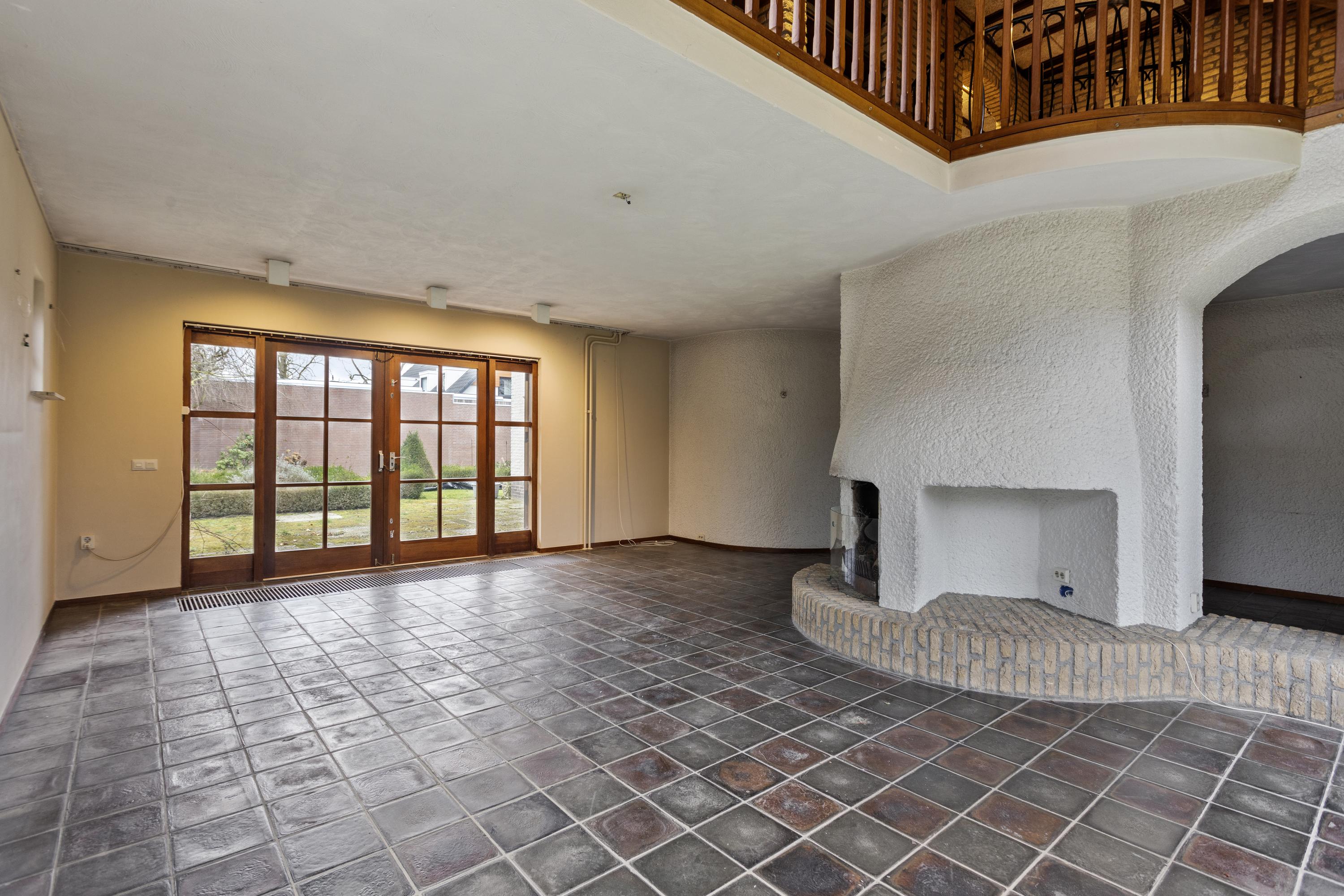 De woonkamer is een verlengstuk van de eetkamer en biedt volop ruimte voor een comfortabele opstelling. Openslaande deuren geven direct toegang tot de achtertuin, waardoor binnen en buiten naadloos in elkaar overlopen. De open haard zorgt voor extra gezelligheid op koude dagen. Een opvallend element is de trap naar de vide op de eerste verdieping, die een speels en ruimtelijk effect geeft. De ramen zijn voorzien van rolluiken voor extra privacy en verduistering.