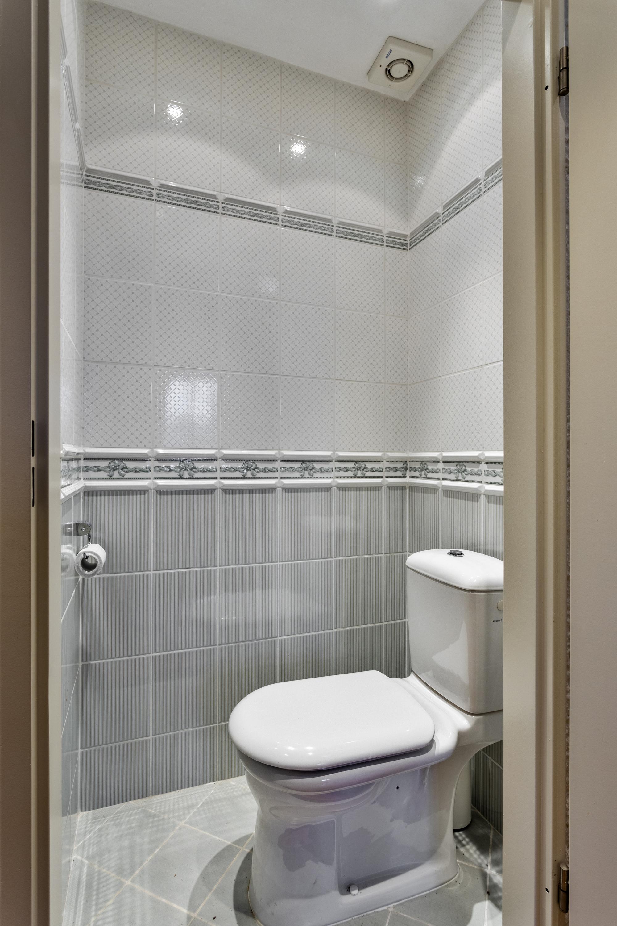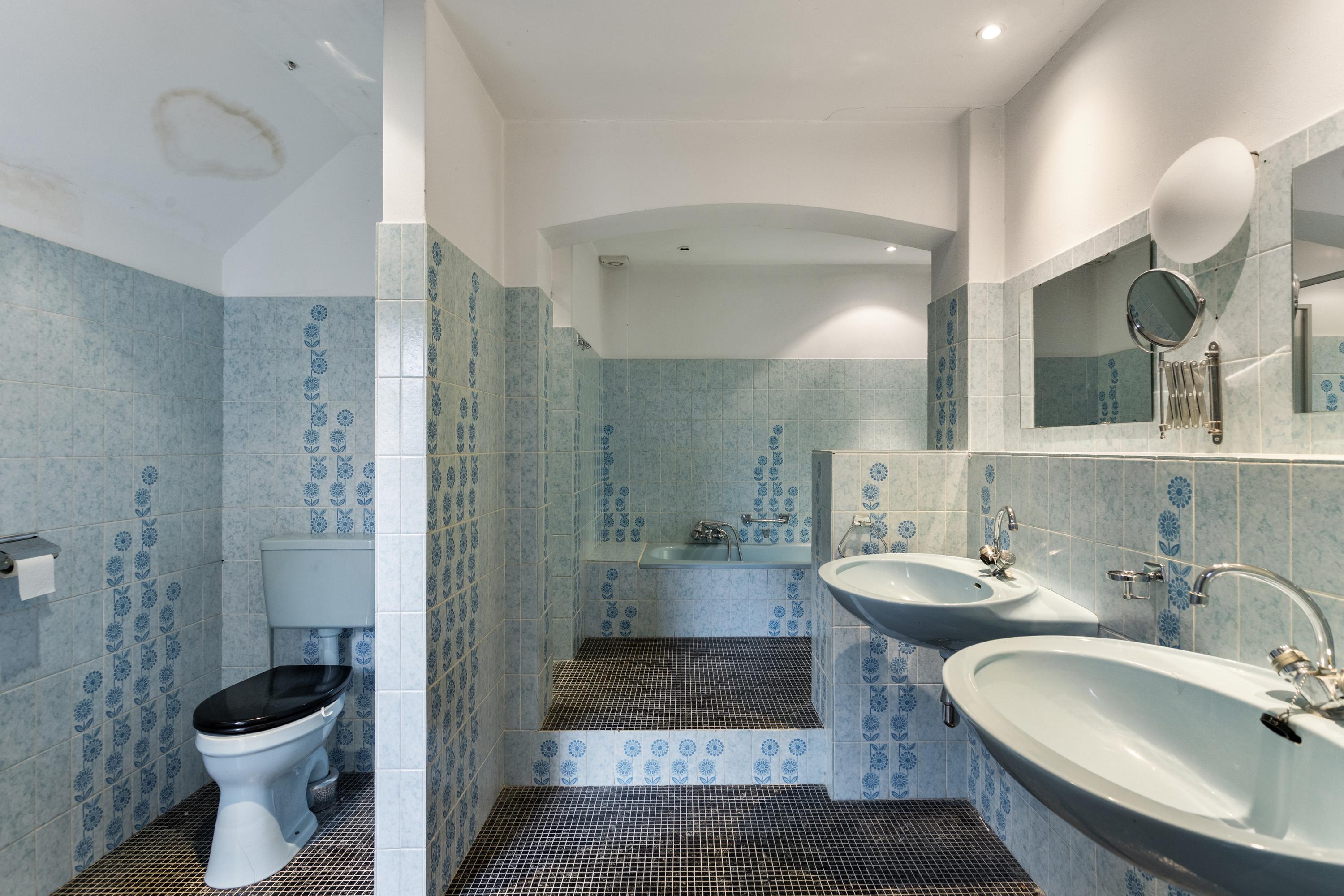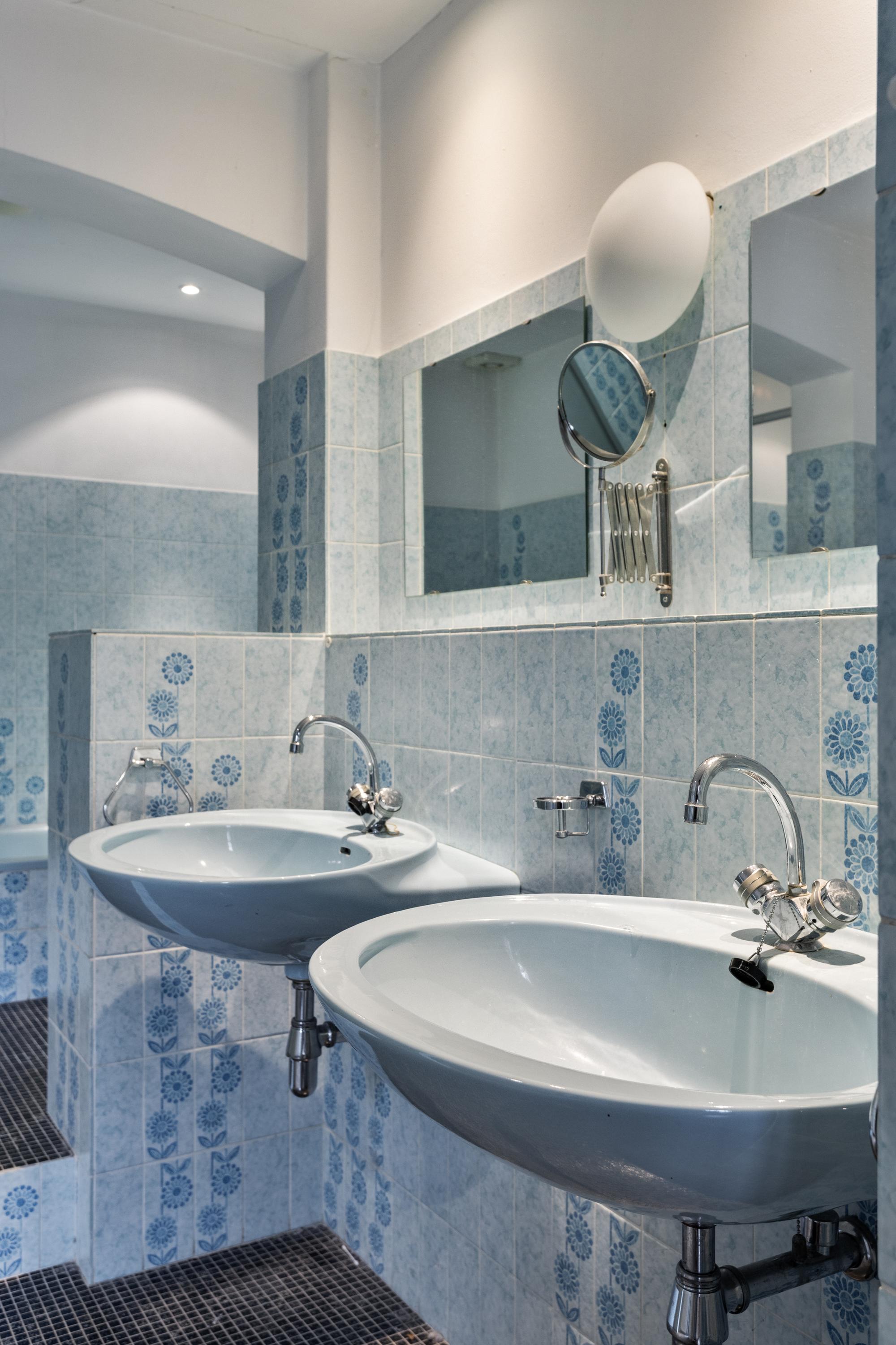 De ensuite badkamer is voorzien van een bidet, twee wastafels, een toilet, een ruime douche en een ligbad. De blauwe tegels en het raam naar het balkon geven de ruimte een frisse en lichte uitstraling.