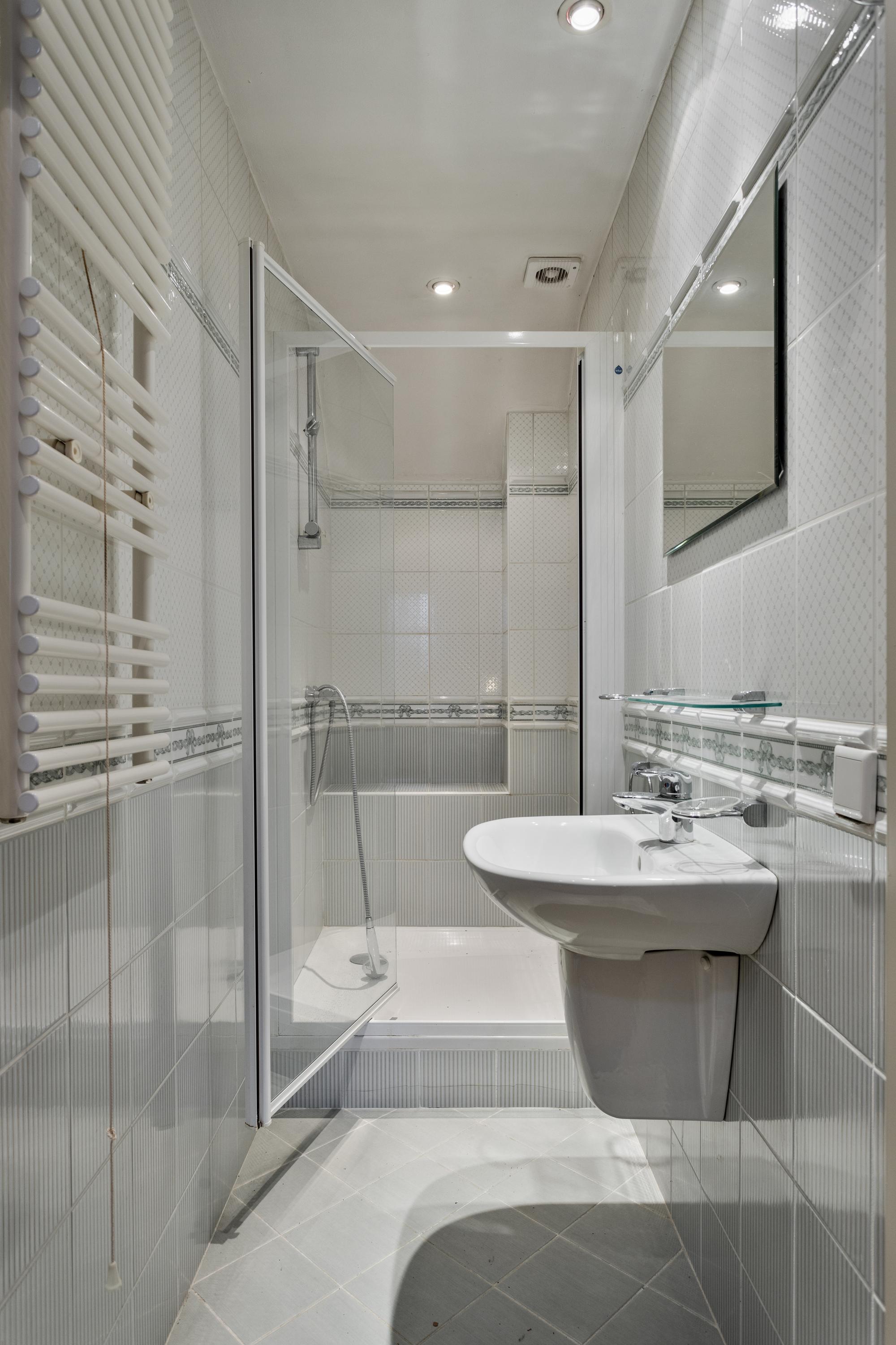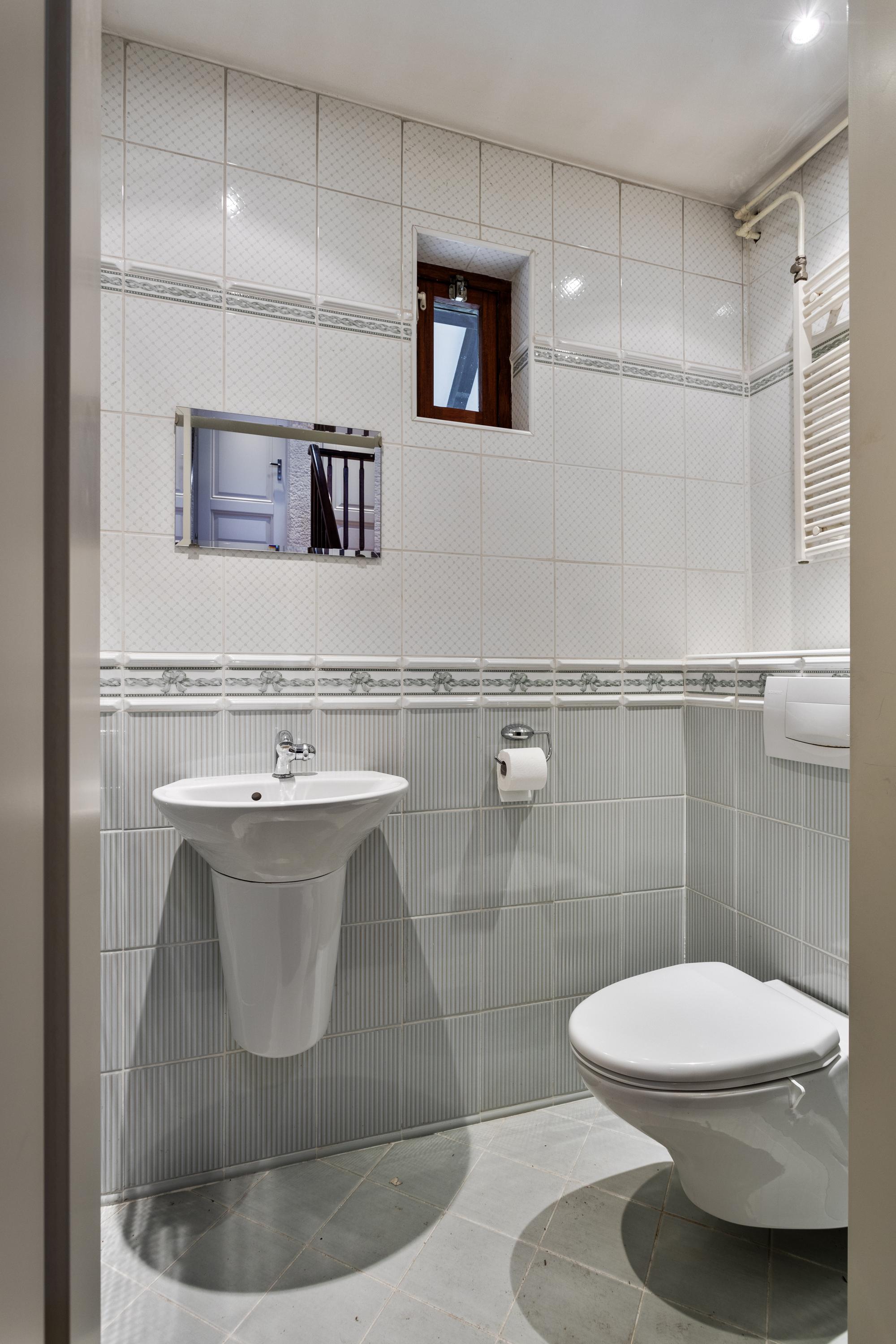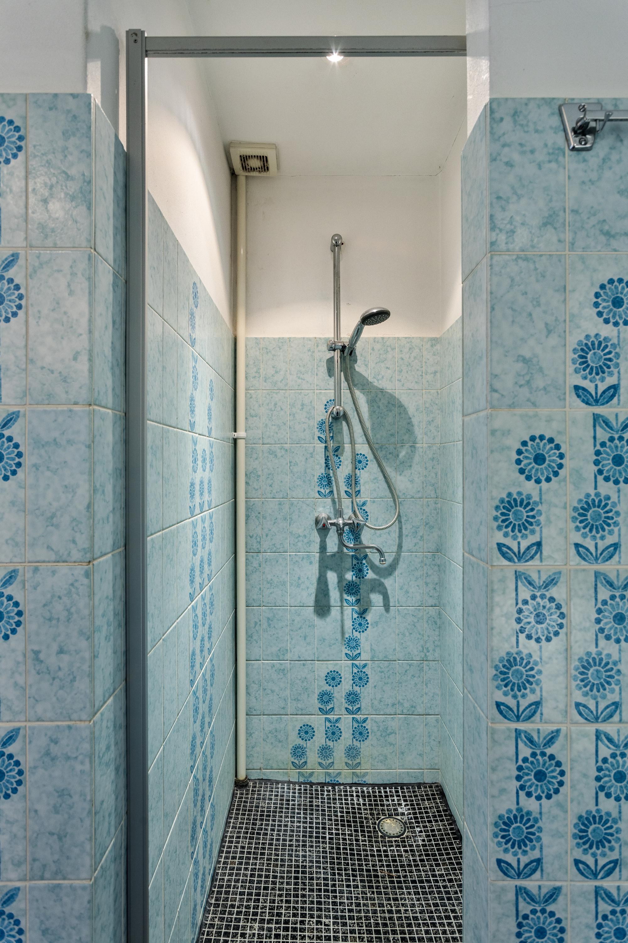 De ensuite badkamer is voorzien van een bidet, twee wastafels, een toilet, een ruime douche en een ligbad. De blauwe tegels en het raam naar het balkon geven de ruimte een frisse en lichte uitstraling.